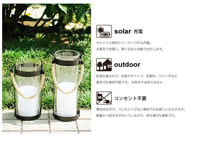 商品名 LED SOLAR LANTERN NOTTE L ブランドメーカー DI CLASSE 品番/型番 MDLA-5392 使用電球 LED電球 1600K(暖色系の灯り) 電源 充電:太陽光 / 直射日光8時間の充電で、約6時間点灯 ソーラーパネル(本体上部)に直射日光を当てて充電してください ※曇りの日やソーラーパネルの周りに太陽光を遮るものがあると、充電に時間がかかります ※雨の日は充電できません サイズ 全体:φ100×H254(mm) ※持ち手は含みません 重量 約0.62kg 仕様 ・防滴仕様(屋外で使用可) ※防水ではないので、大雨のあたる場所や水がたまる場所でのご使用は避けてください 素材 シェード:スチール、ガラス、麻紐 キャンドルパーツ:ポリプロピレン、プラスチック(ABS樹脂) スイッチ センサー ON/OFF (暗くなると自動で点灯。